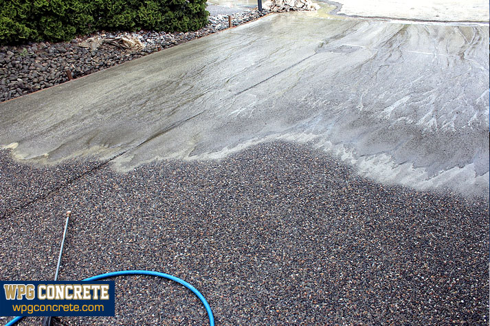 Once the base preparation is done, we then placed a new exposed aggregate concrete driveway. After being cleaned thoroughly, we complete the project by acid washing the driveway and coating it with a commercial grade concrete sealer.
